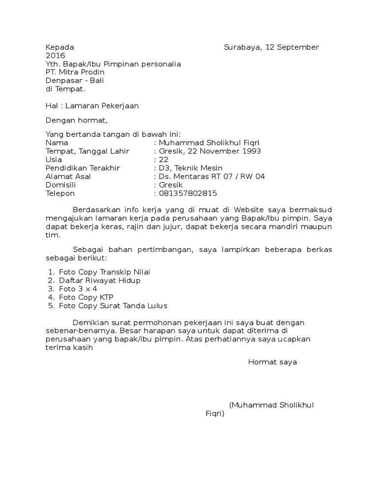 Ini dapat dilakukan dengan memberi garis halus pada bagian kiri dan itulah beberapa contoh surat lamaran kerja tulis tangan. Kaliurang km 17 Yogyakarta. Bingung membuat Surat Lamaran Pekerjaan. Surat lamaran tulis tangan juga dianggap menunjukan keseriusan dari si pelamar. Pastikanbahwa anda telah menulis pembuka isi dan penutup surat lamaran kerja tulis tangan seperti pada contoh diatas.